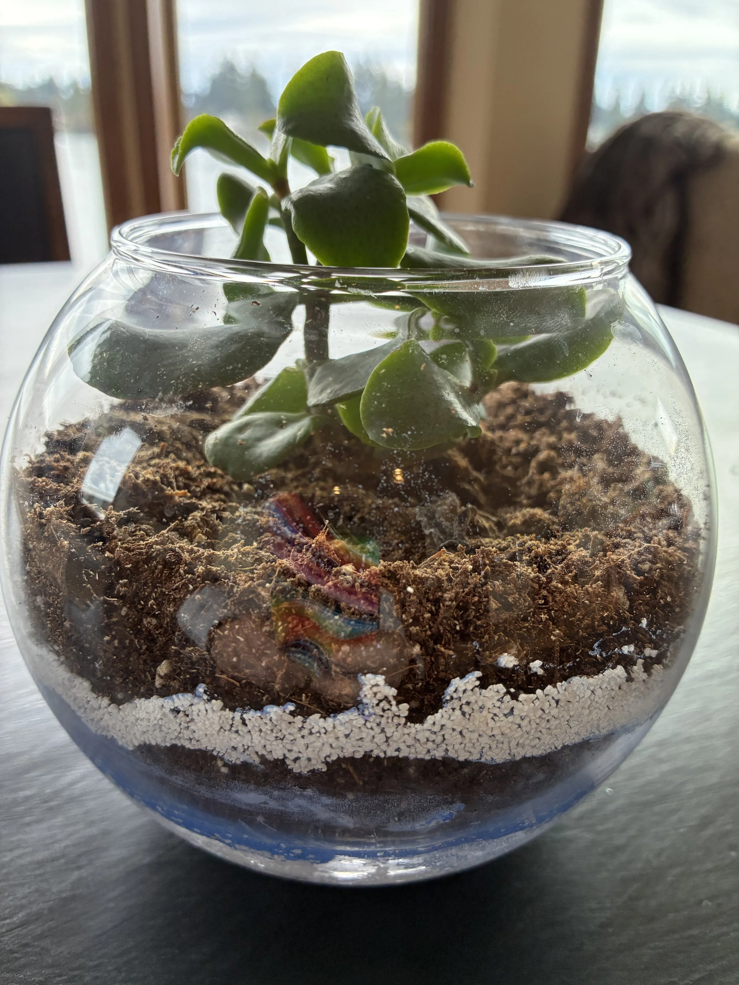 You will choose from plants curated to grow in our low light winter conditions. The 8 inch round bowl has a bottom hole drilled to alleviate typical terrarium troubles. Select sand to customize your bowl to suit your taste.